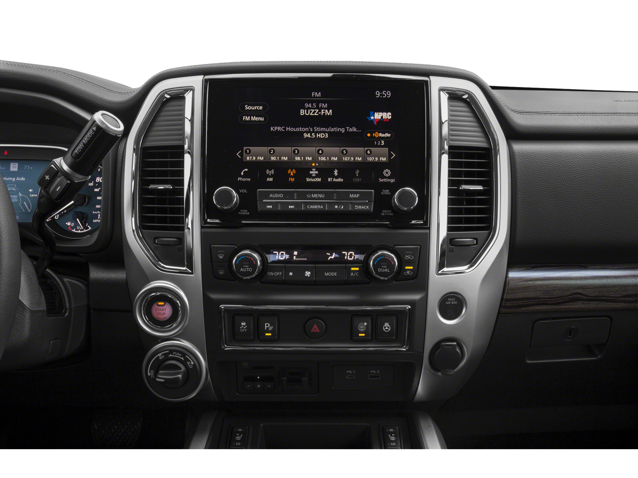 - Radio: NissanConnect w/Navigation -inc: 9" touchscreen display, 12 speaker Fender premium audio system, Apple CarPlay, Android Auto, HD Radio, SiriusXM satellite radio, SiriusXM Traffic, SiriusXM Travel Link w/weather, fuel prices, movie listings, stock info, sports and parking, TomTom weather, Nissan door to door navigation w/3D building graphics and satellite imagery, online POI search, over-the-air map updates and online premium traffic information, 2-USB (1 type A, 1 type C) connection ports for iPod interface and other compatible devices, 2 USB A ports (charge only), Bluetooth® hands-free phone system, streaming audio via Bluetooth®, hands-free text messaging assistant, Nissan Connect services, WiFi hotspot, Nissan voice recognition for navigation and audio, Siri Eyes Free and follow me home function